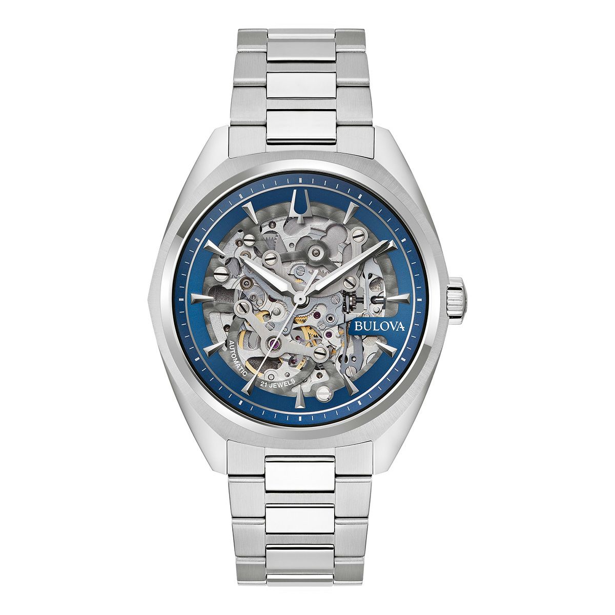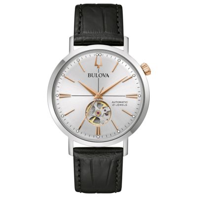 ブローバのコレクションのなかでも個性ある大人な雰囲気が際立つ「クラシック」のスケルトンモデル。文字盤は自動巻きムーブメントの構造を楽しむことができるスケルトンデザインに、大ぶりなローマン数字インデックスとバーインデックスをミックスして大胆にセッティング。クラシカルながらもラグジュアリーで力強いデザインが目を引く、ブラックモデルです。